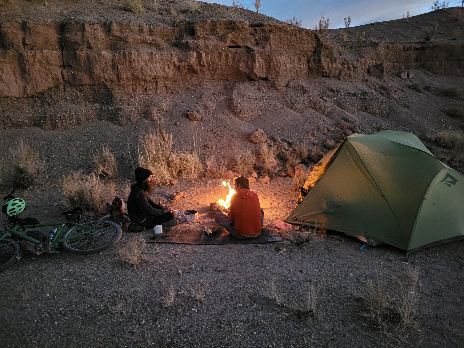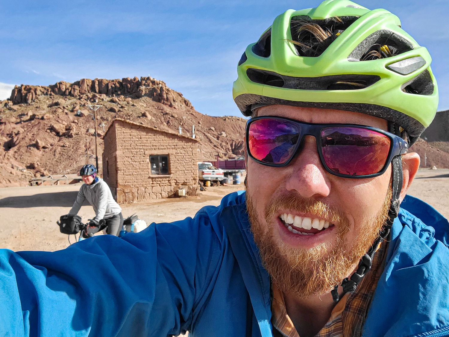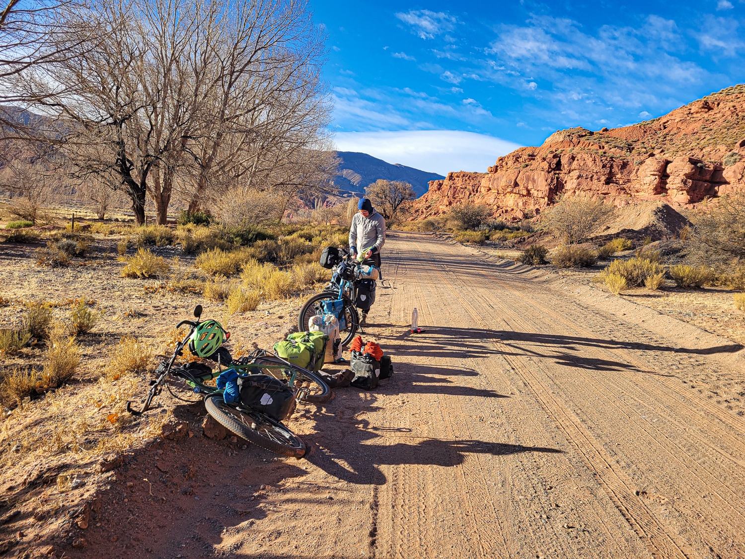 Så skulle vi ned mod Argentinas saltsøer og videre mod vest her fandt vi asfalt igen, men også vores gamle ven – den stærke vind fra vest. Det krævede nogle dages cykling i stærk modvind mod grænsebyen Jama, hvor vi måtte sove i ruiner for at finde læ for vinden. Men heldigvis fik vi en vindstille dag mod byen Jama. Her havde vi forventet at tage en hviledag og Jace ville cykle alene videre. Men det viste sig at være en by uden noget som helst og de steder vi kunne have boet var optaget af arbejdere. Så vi fandt en forladt bygning og slog teltet op der.