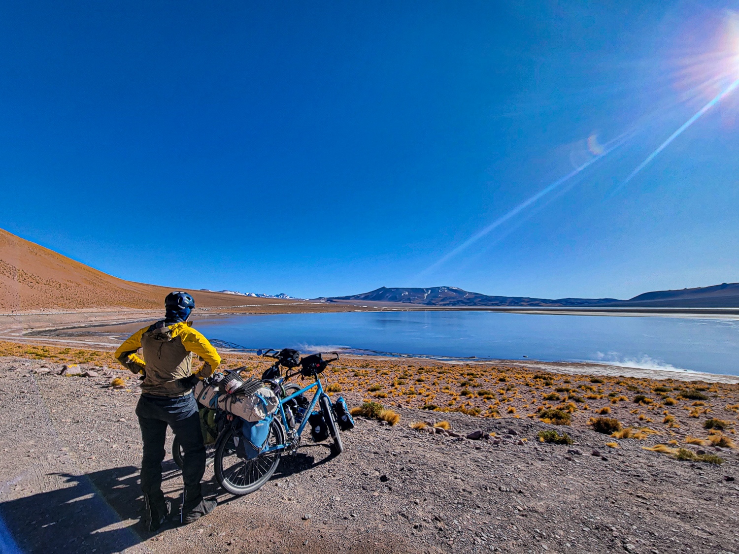 Det var koldt i Jama nok -15 grader om natten. Så næste morgen blev vi enige om at tage turen mod Chile samme dag istedet for at tage en hviledag. Jace var taget tidligt afsted og ville cykle hurtigt mod San Pedro de Atacama, som var vores endemål i Chile. Vi skulle lige handle lidt ind og krydse grænseposten. Vi fik hurtigt købt mad til 3-4 dage som vi regnede med det ville tage at krydse ind i Chile og mod San Pedro de Atacama. Men grænsen tog os 5 timer at krydse, så vi kom sent afsted. Vi vidste at vi skulle op i 4800moh med en lang stigning med nogle små bjerge på vejen. Så vi var ikke glade for at starte sent, men heldigvis var der ikke så meget vind så vi kom derop og fandt et sted med lidt læ for den vind der kom om aftenen. Det var koldt og helt øde her, mere end vi havde oplevet før.