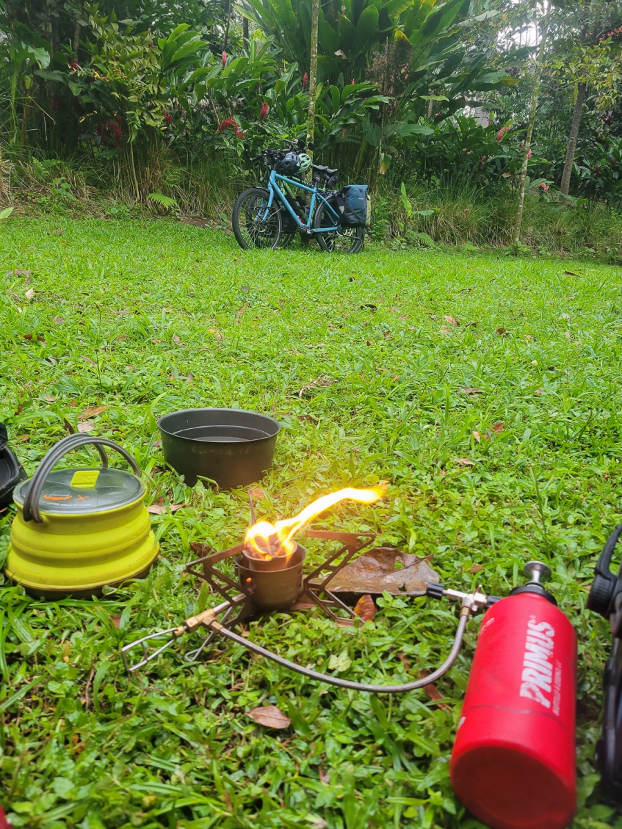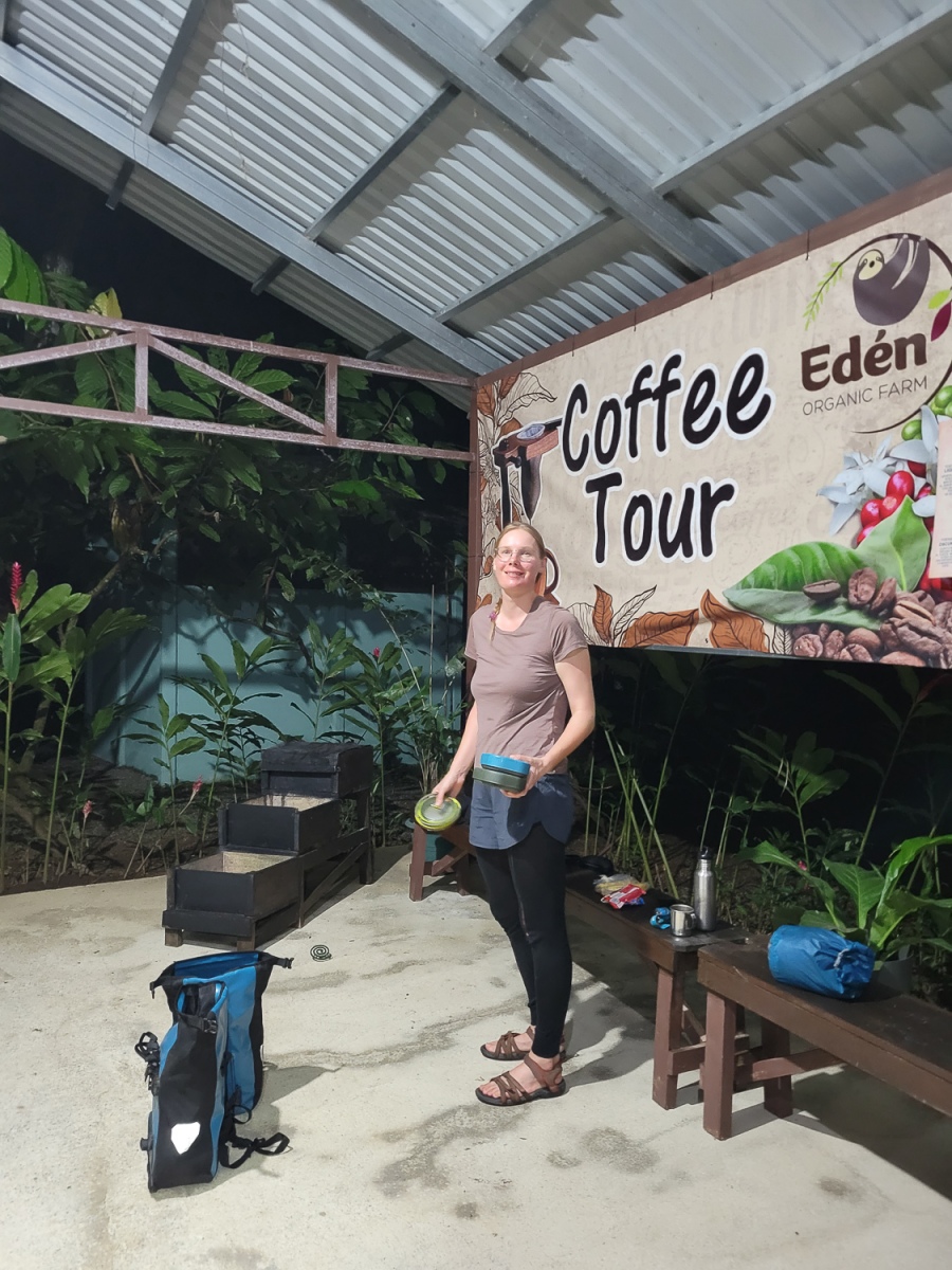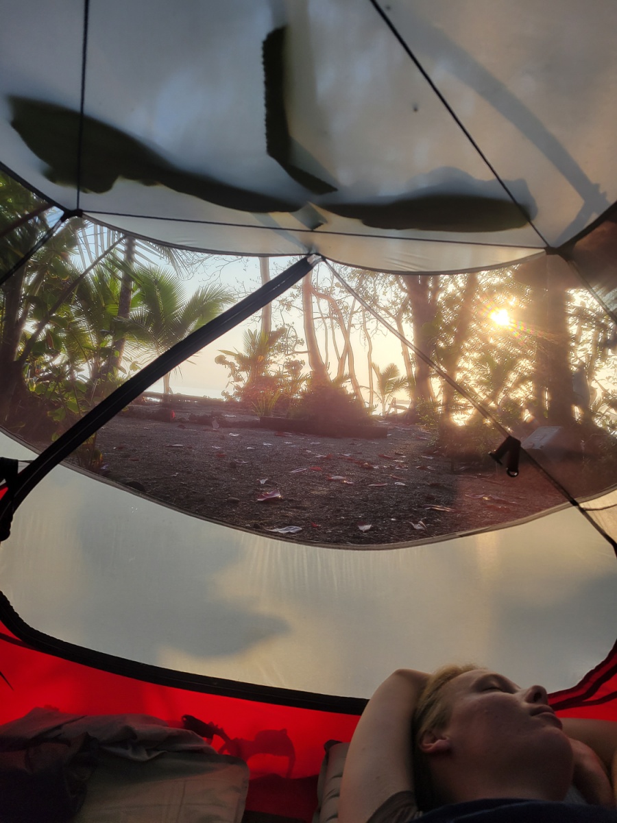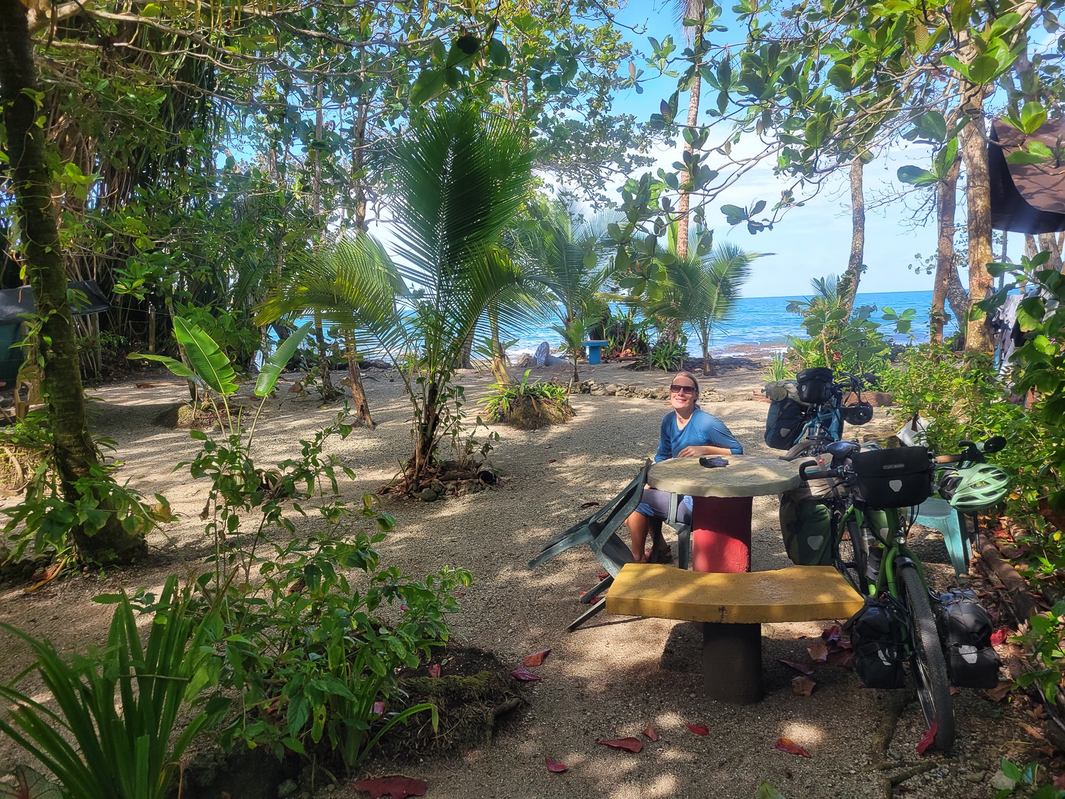 Budgettet rækker ikke til mange overnatninger på hotel, men vi bliver forkælet med skønne naturrige campingpladser hele vejen gennem Costa Rica, og får mod forventning brugt vores telt på trods af varmen. Det er nærmere reglen end undtagelsen, at vi sover med et dovendyr i træerne ovenfor, og hilser på en flok aber om eftermiddagen og morgenen. En aften vi laver aftensmad på vores benzinbrænder, ser vi en kuglemyre, som efter sigende lever op til sit navn; det skulle gøre lige så ondt at blive bidt af sådan en, som det gør at blive skudt.